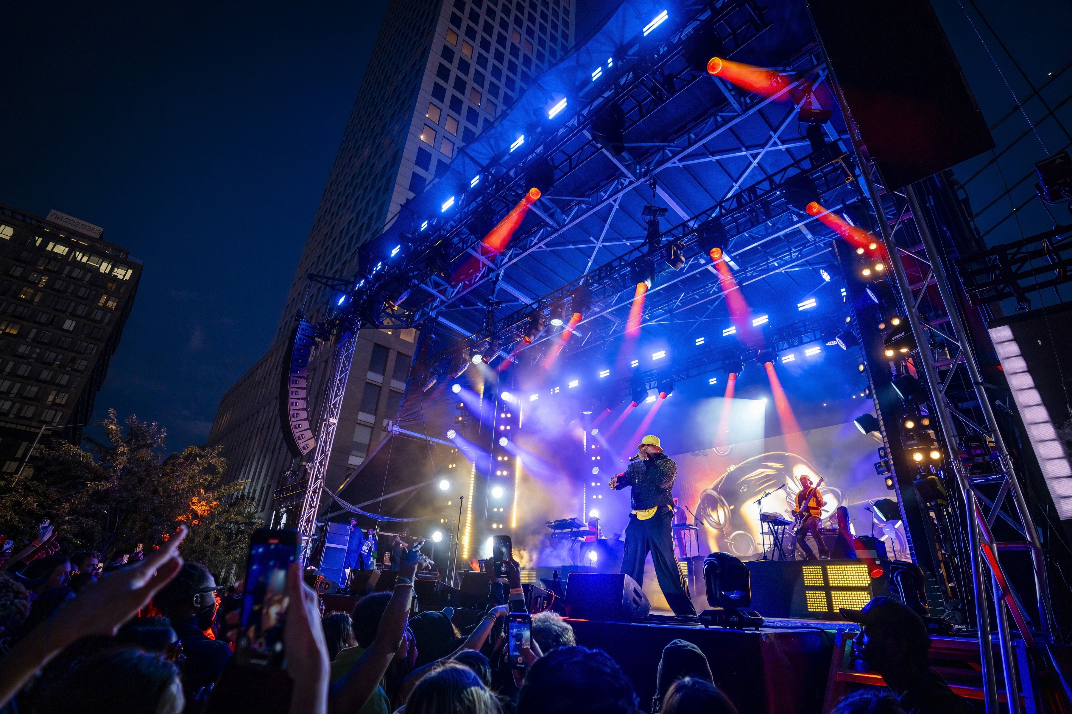 The production required three interconnected activation areas that GPJ designed to work in harmony: the central reveal stage in Domino Square, a concert stage in Domino Park on the riverfront, and a presentation stage built atop a barge in the East River.